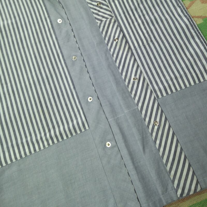 ストライプとグレーシャンブレー、2タイプの切替デザインのリバーシブル。半袖シャツでリバーシブルというユニークなアイデアを形にした一枚です。