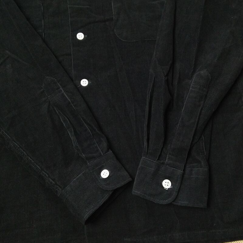 襟はミシンステッチ&プラ芯入り、トップボタンはループ留め。ブラック細畝コーデュロイ生地(100%コットン)。MADE IN JAPAN