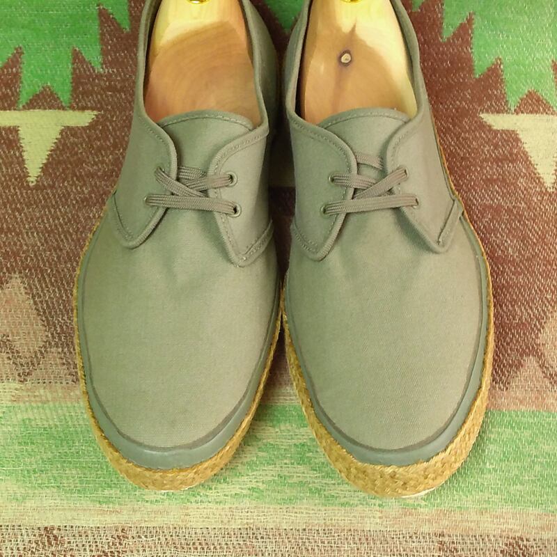 セージグリーンのキャンバス生地。エスパドリーユのようなサイドにジュートを巻いたデザイン。アウトソールは低くヒールがありごつごつとしたOLD感あるラバーソールです。