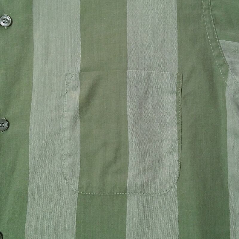 モスグリーン×グレーのワイドストライプ、ポリコットンらしい薄手でさらっとした生地感です。