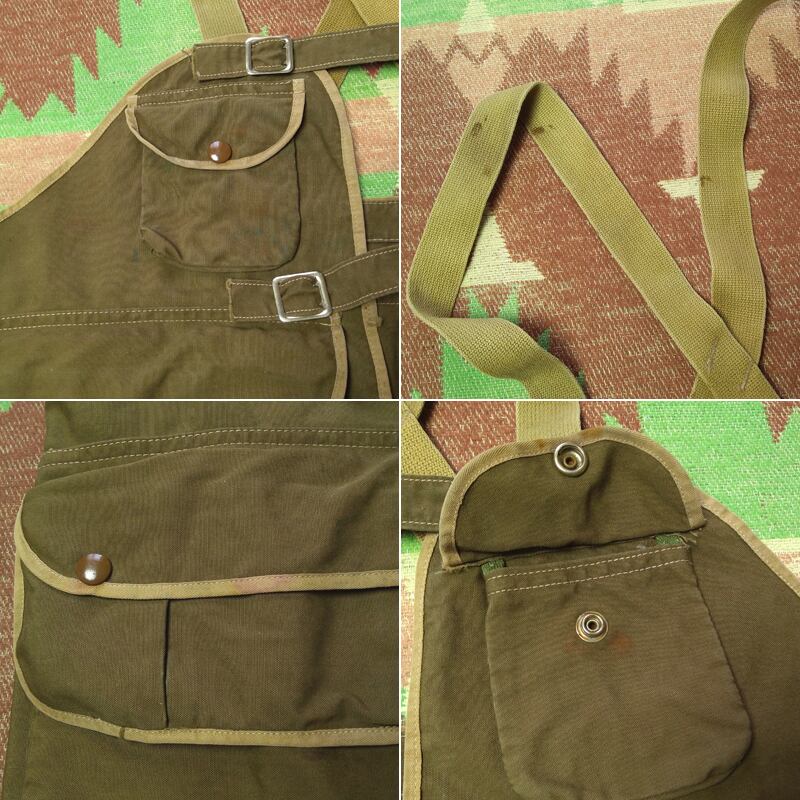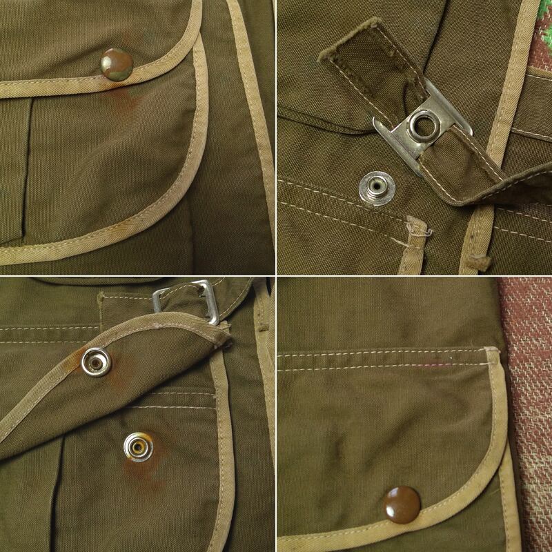 スナップに塗料剥げや錆びが見られ、それらが転移したシミがあります。そのほか、ところどころシミは見られますが、フィッシングやハンティング系のアイテムとしては特別ひどいものではないと思います(洗濯済み)。破れなどのダメージは特になく生地は良い状態です。