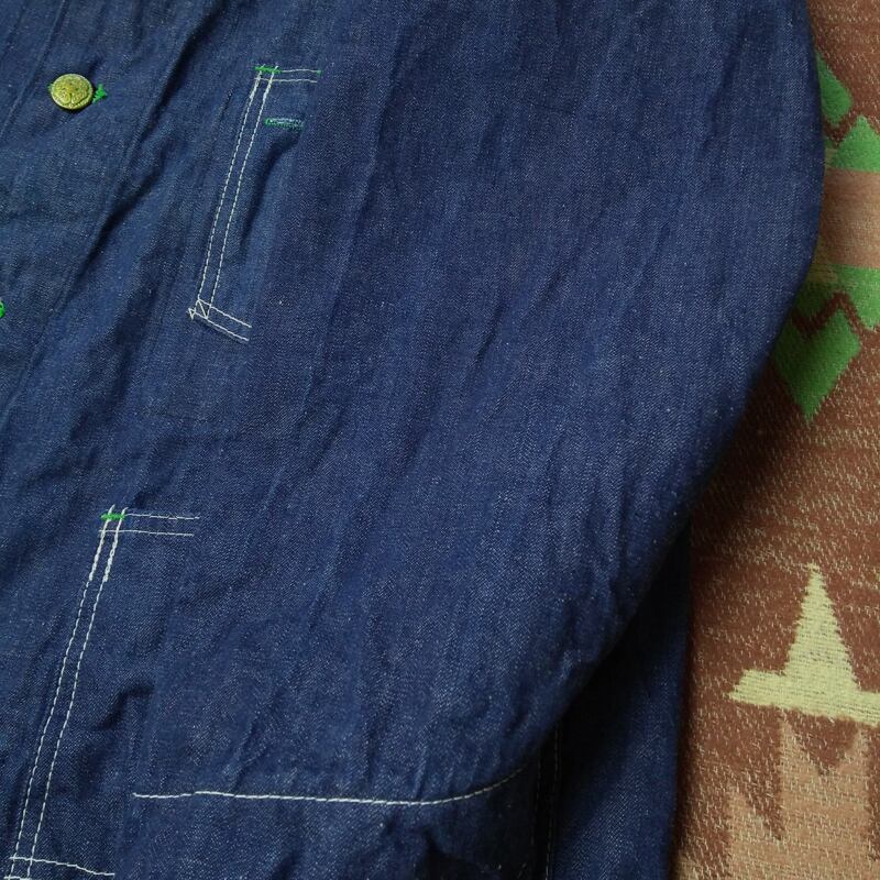 2~3ウォッシュ程度、洗いたてでバリっとした風合いです。ほとんど使用もされていないと思います。左胸・襟・袖などにわずかな擦れ色落ちが見られる程度で、ダメージや目立つシミ汚れのない良好なコンディションです。