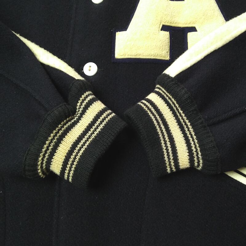 メルトンウール生地(裏地なし)、ポケット口レザー。黒もしくは黒に近いダークネイビーにも見えます。リブは黒、シニール台のフェルトはネイビーです。