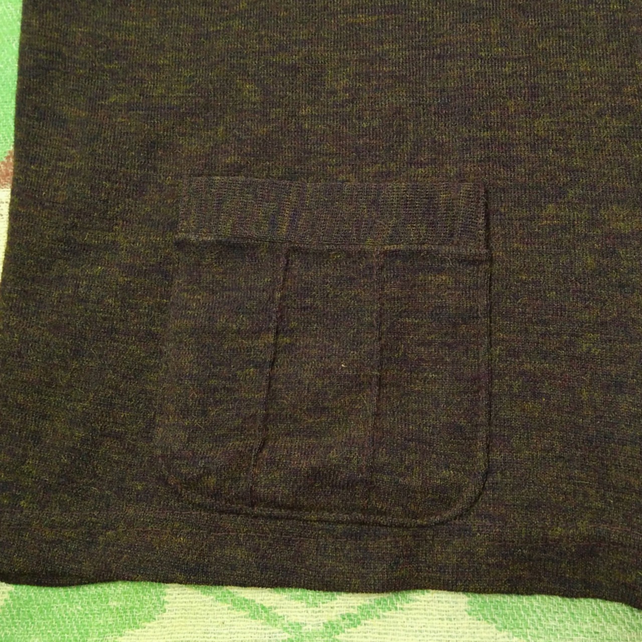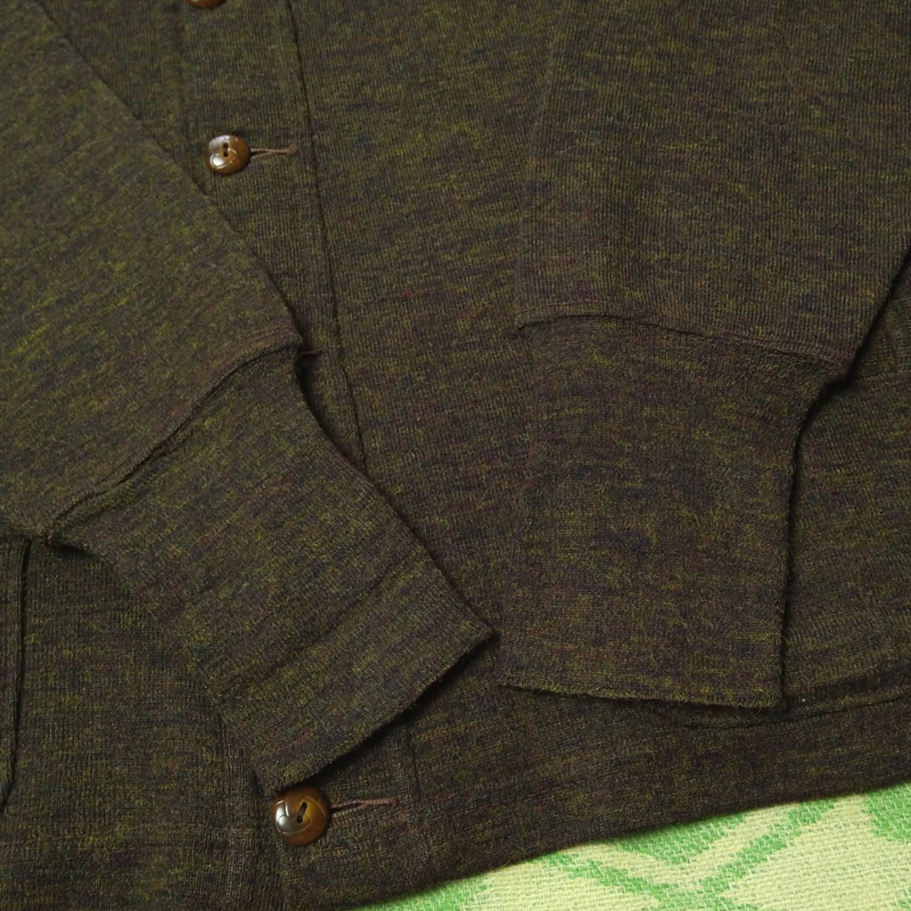 ダークブラウン系のミックスカラーニット(100%ウール)。半円型のダブルエルボー。OLD感あるダーツ入りパッチポケット、ベークライト調ボタン。