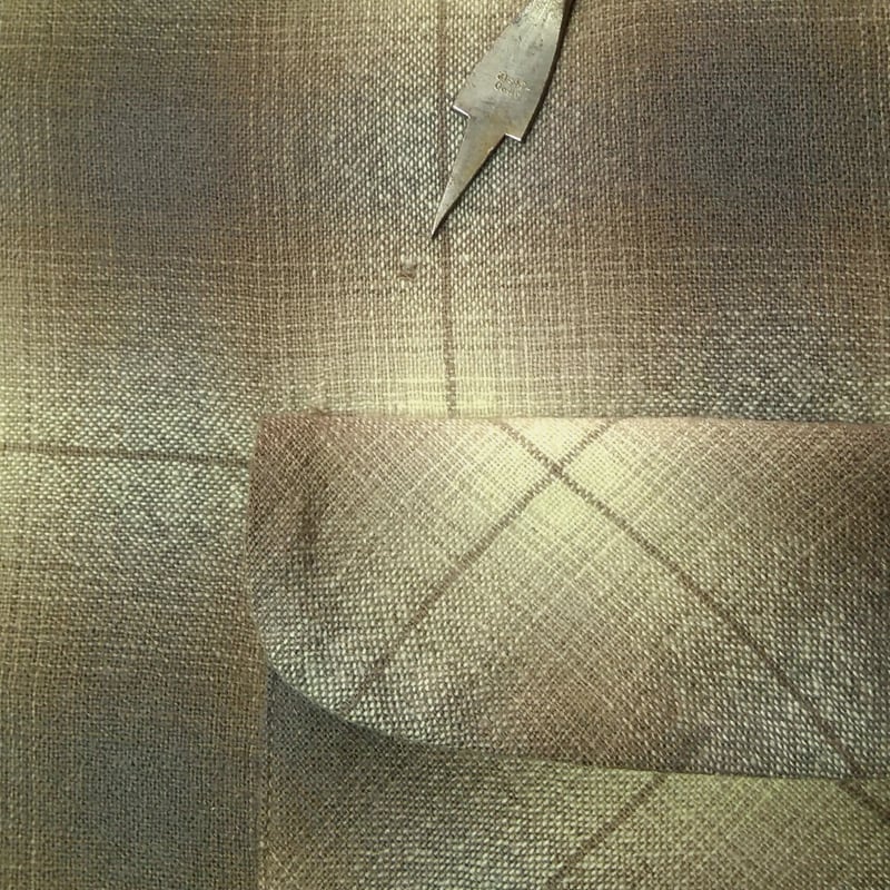 袋襟、トップボタンはループ留め、フラップポケット。モカっぽいブラウン系のシャドーチェック、100%ヴァージンウール生地。