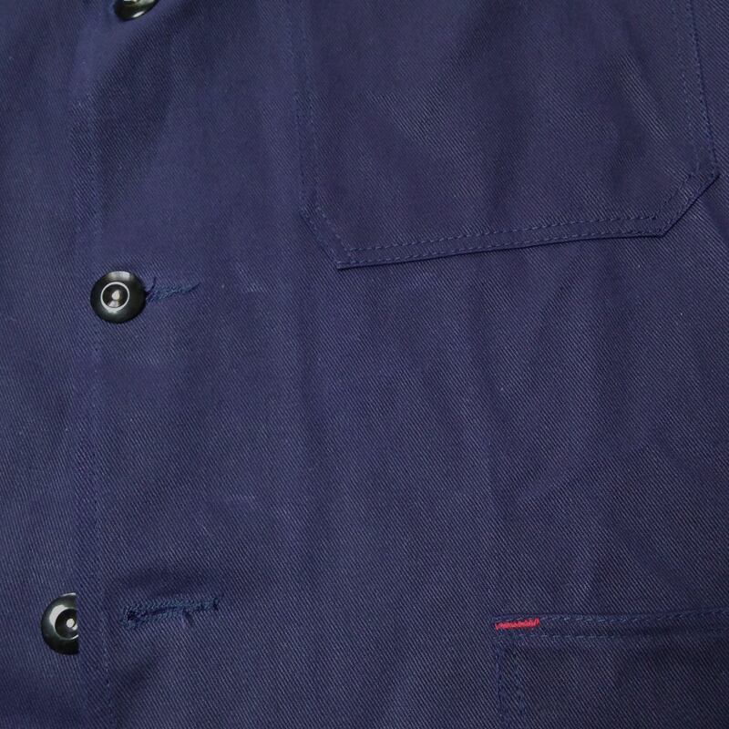 若干赤味がある感じのダークネイビー、100%コットンのドリル(ツイル)生地。フロントはチェンジボタン留め、3パッチポケット。赤いカンヌキが良いアクセントになっています。