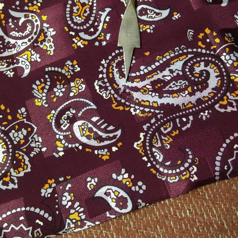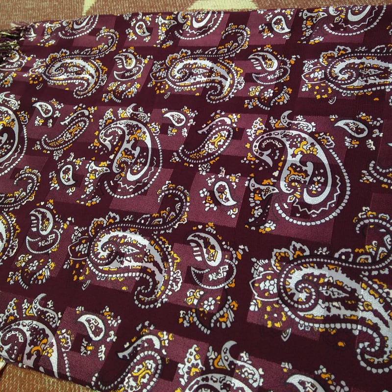 バーガンディベースにペイズリー柄プリント、中抜き四角の織り柄入り。