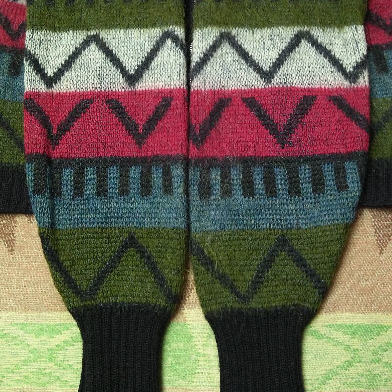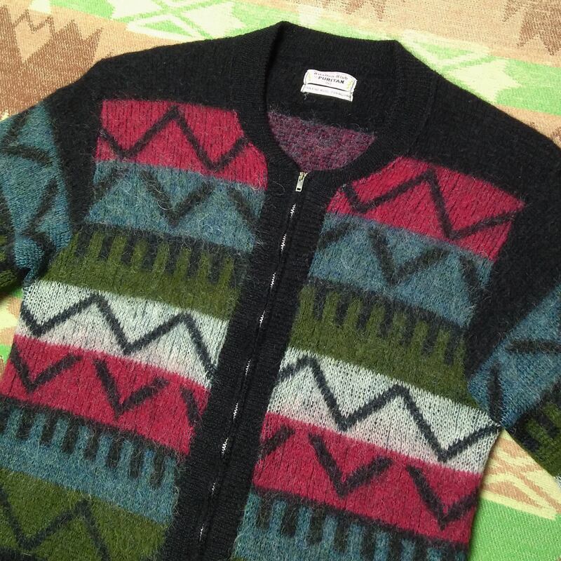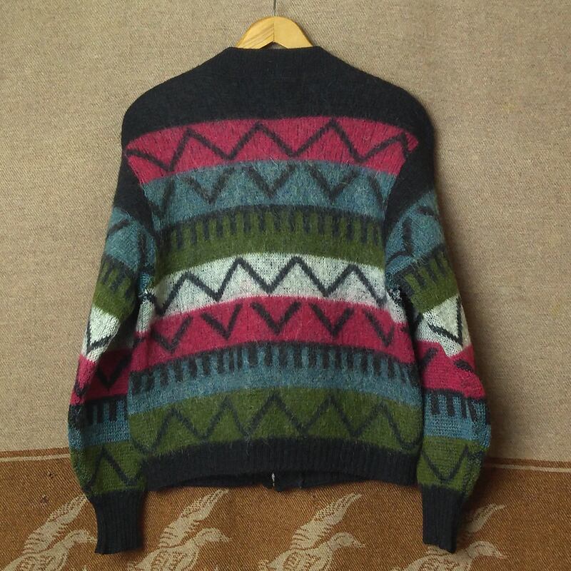 ネイティブアメリカン調の柄にも感じられる配色&柄が良いモヘアカーディガンです。