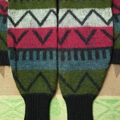黒を基調にワインレッド・サックスブルー・モスグリーン・白のボーダーパターンにジグザグ模様と鍵盤のような柄。75%ウール×25%モヘア素材。NYNCOジッパー。