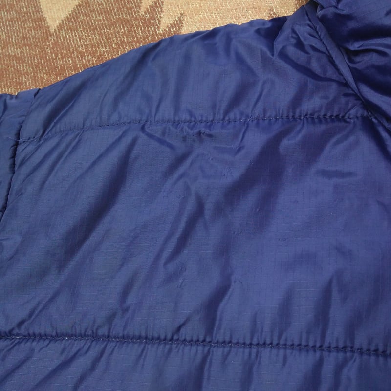 正面や袖などに伝線した箇所・左ポケットの際にダメージはありましたが、大きなダメージはありません。袖口や裾などのパイピングは良い状態です。ロゴ入りのジッパープラーは左ポケットのみ残っています。お腹や袖先などに黒ずみシミ汚れはありますが、シワや生地の光沢に紛れますしダークトーンボディですので、すごく目立つほどではないと思います。古着慣れされた方でしたら問題なく着られるコンディションと思います。
