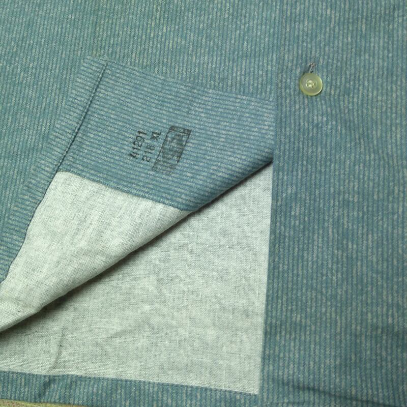 ブルーグレー系、杢っぽい斑模様にストライプのプリント、100%コットン ライトフランネル。袋襟(プラ芯入り)、トップボタンはループ留め。