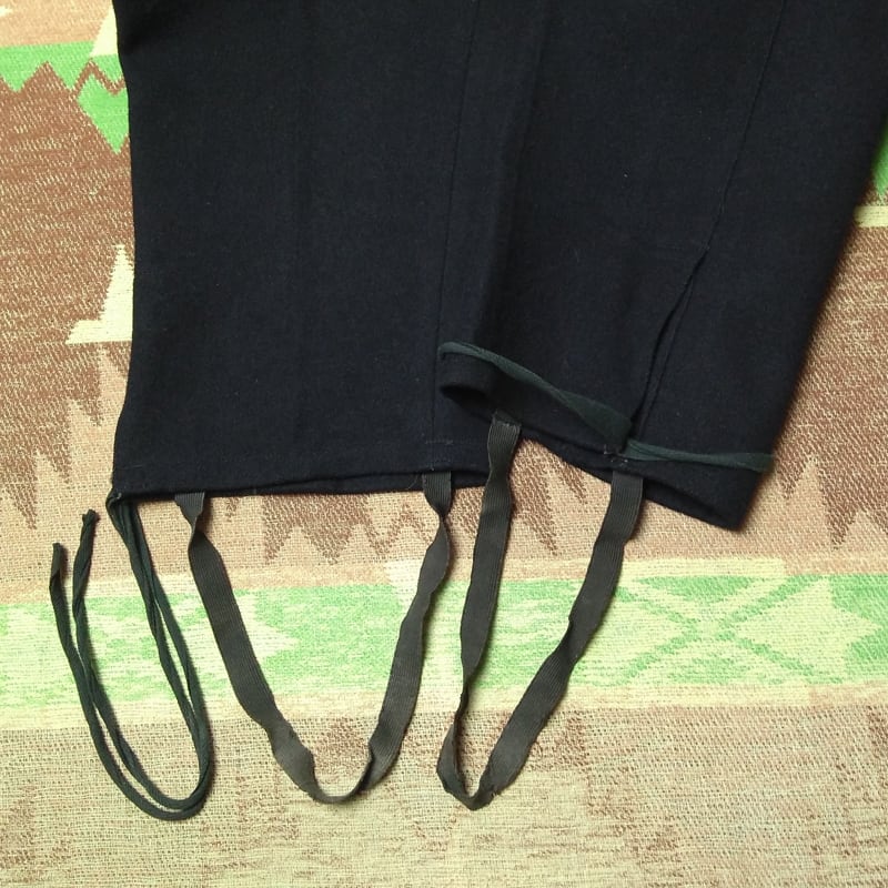 ブラックのメルトンウール、コート類等に比べると軽めの生地感です。スキー等のウインタースポーツ用、裾には紐とゴムが付いています。パンツでは珍しく扇ALONジッパーが使用されています。