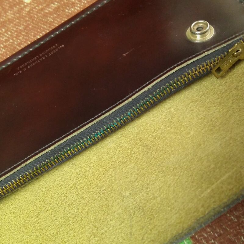 しっかりとした重量感があるブラス・ゴールドトーンのスチール製チェーン付き。札入れ2ヶ所とジッパーコインケースのタイプ。FALCONジッパー。