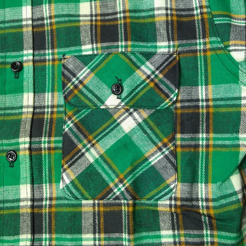 グリーン基調のチェック、100%コットン。ロングポイント襟(プラ芯なし)、メインシームダブルステッチ。