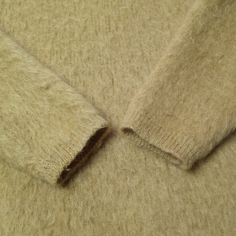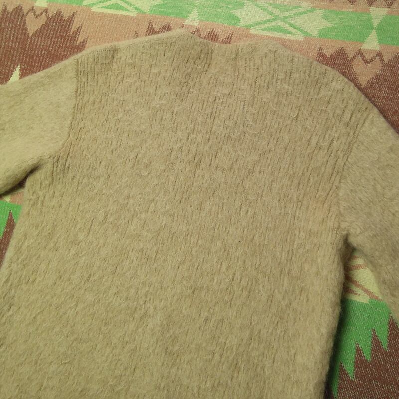 お腹に手縫いリペアがありますが、全く目立つものではありません。肩や背中上部など若干毛が薄くなった部分や編み目が広がった感じが見られますが、ヴィンテージ モヘアではよく見られる標準的なレベルでひどいものではないと思います。肘や袖口は問題ありませんし、全体的には毛足のシャギーな風合いが感じられる良い状態です。