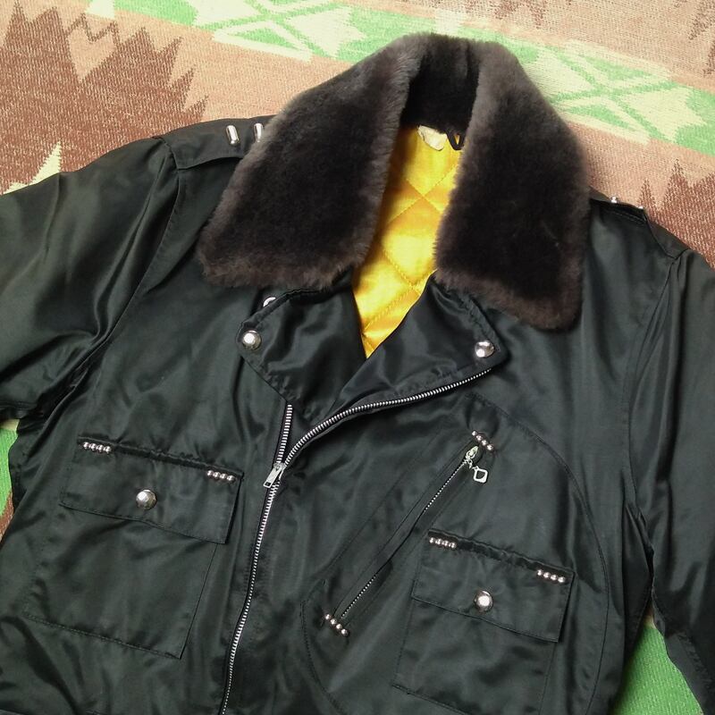 黒サテン生地、ボア襟、キルティングライニング。肩にカマボコ型・ポケット等に4連スタッズ付き。CONMARジッパー。