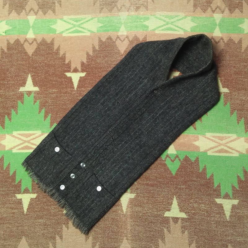 スカーフとカーディガンを合わせたその名も≪Scardigan≫。1959年パテント。ポケット(ボタンは飾り)が左右に付き、ボタンを留めると前身のみのベストのようになります。風が強い時やバイクに乗る方などは活用できると思います。もちろん普通のマフラーのように巻いてもOKです。