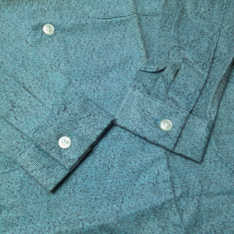 ターコイズにブラックネップ調のプリント、100%コットン ライトフランネル。襟はミシンステッチ入り(プラ芯なし)、トップボタンはループ留め。