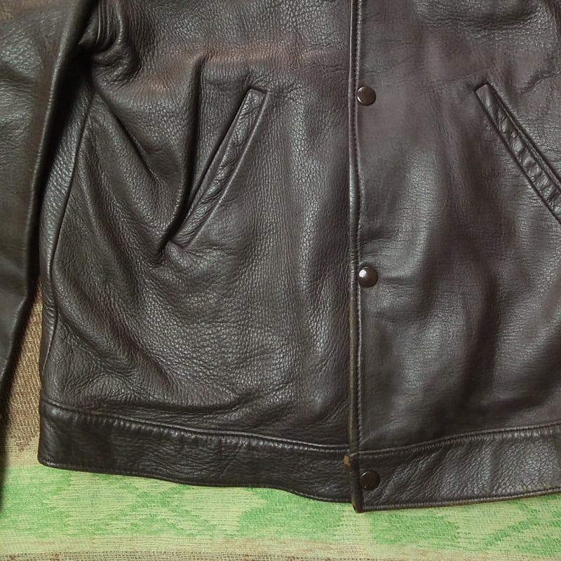 袖口や胸・お腹などに擦れ、襟に若干表面が荒れた部分、そのほかところどころ擦れ等は見られますが、特別気になるようなダメージはありません。柔らかく革質は全く問題ないです。