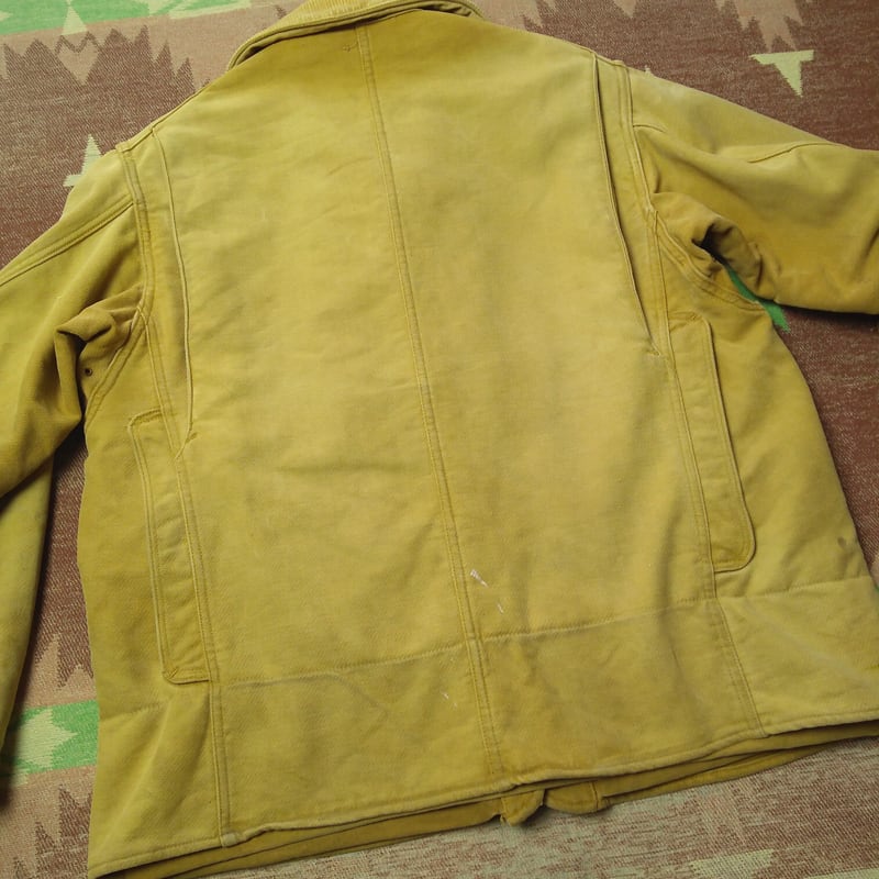 ザクザクとした織りの表面で裏起毛の分厚いモールスキン、ヘビーで防寒性があるアウタージャケットです。※黄色味が強くビビッドに写っている画像があります。襟とカフス裏はコーデュロイ。