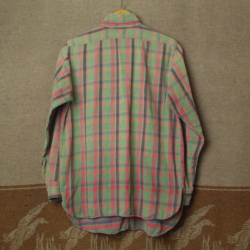 グレイッシュグリーン×レッド×ネイビーのチェック、フランネル生地。襟ダブルステッチ、裾サイドはマチ付き。