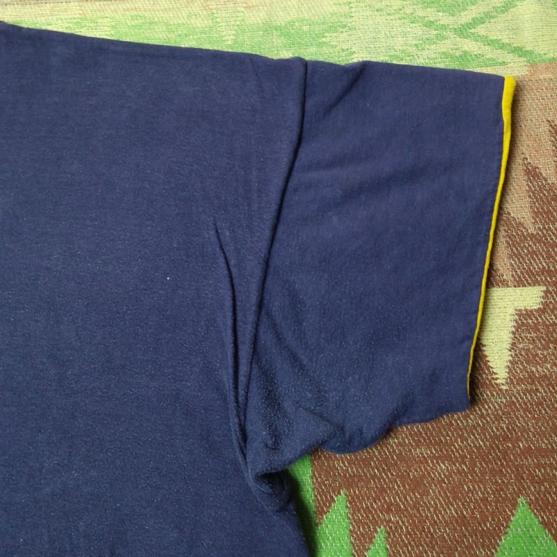 紺面は無地、黄色面は黒文字の染み込みプリント。ネックの抜け具合も抜群の雰囲気です。