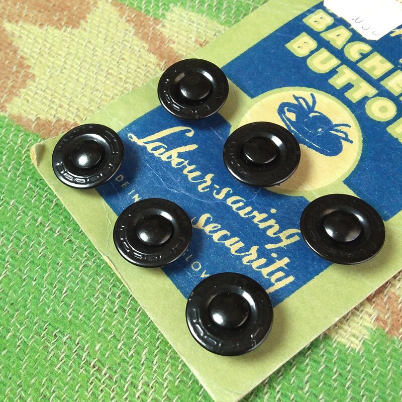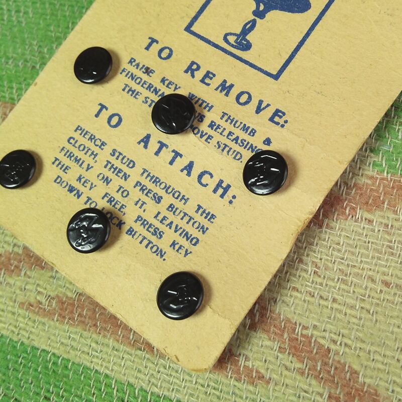 便利なデタッチャブル(着脱可能)ボタンです。黒塗り×6個。ボタンに“PILCHER”刻印、パッケージ右上に“KOH-I-NOOR(WALDES)”のシンボルマークが入っています。この時代の金具などに多いチェコスロバキア製です。