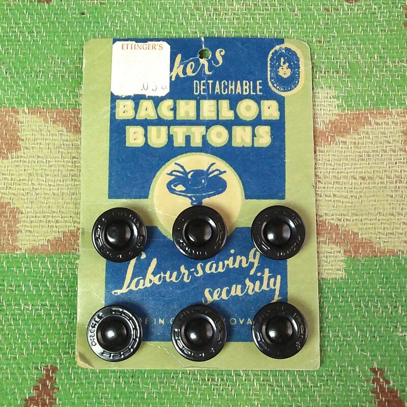 便利なデタッチャブル(着脱可能)ボタンです。黒塗り×6個。ボタンに“PILCHER”刻印、パッケージ右上に“KOH-I-NOOR(WALDES)”のシンボルマークが入っています。この時代の金具などに多いチェコスロバキア製です。