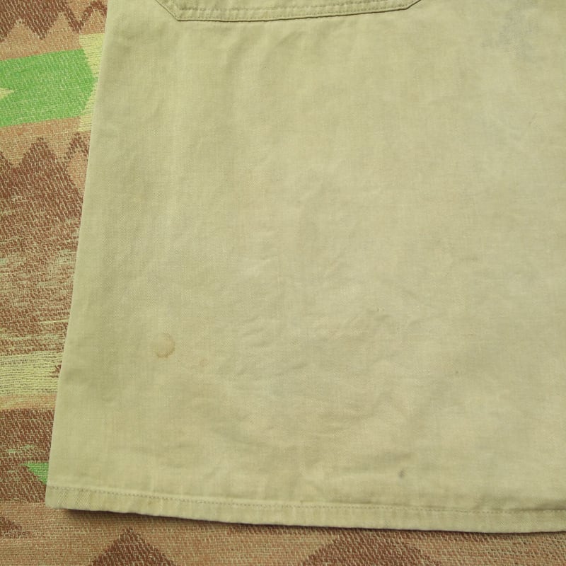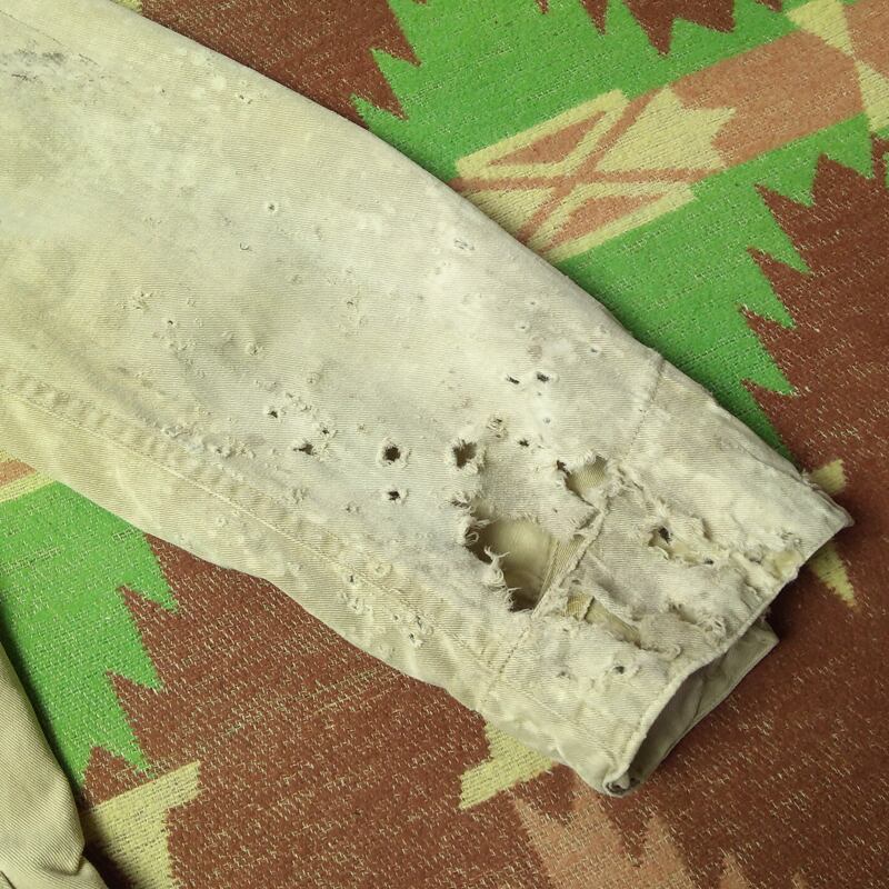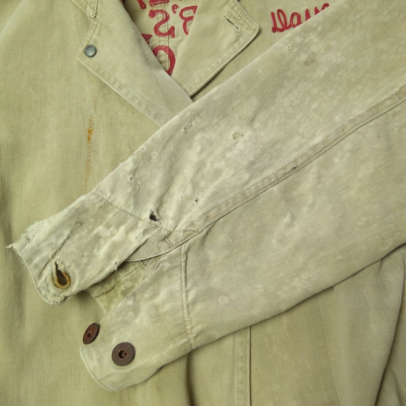 左袖から左身頃を中心にダメージや色抜け・シミ汚れが多く見られます。全体的な雰囲気は画像にてご確認いただけると思います。※一度洗濯済みです。色抜けした箇所は生地が弱くなっていてダメージは進行する可能性があります。ボタンは錆びていますが、すべて揃っています。