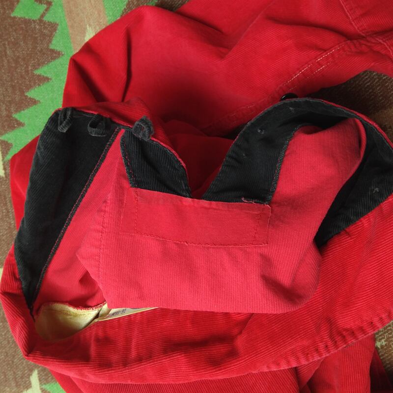 レッド×ブラックの細畝コーデュロイ生地。プルオーバー、ループ留めボタン、襟は袋縫い丸襟。襟とポケット口にハンドステッチ入り。