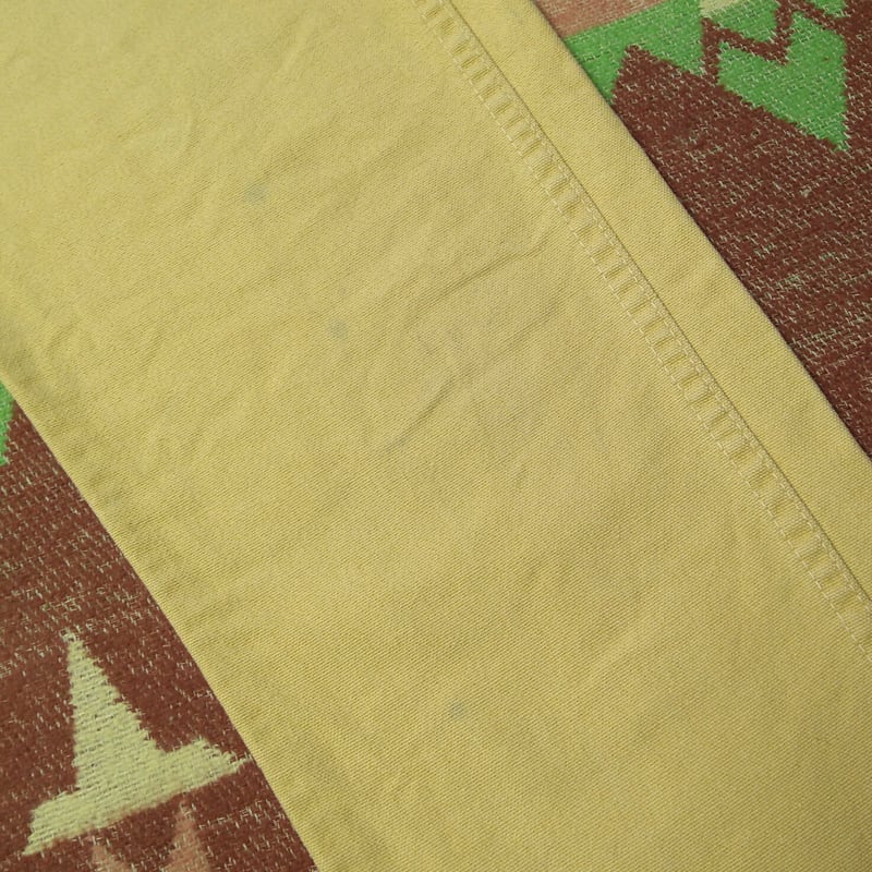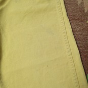 黄色味がかったベージュ・くすんだレモンイエローといった感じのダック生地、100%コットン(表記はなし)。ポケットの中などを見てもブラウンダック等のような暗い色の部分はありませんので、色抜けしたものではなくオリジナルのカラーと思われます。