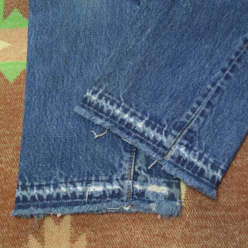 両脚付け根あたり・右ヒップポケット右下・左脚裾近くにダメージ、ウエスト上端やヒップ周辺に擦り切れ、フロントポケット袋の角に補修、膝などに薄いシミ汚れ、など見られますが、まだまだ問題なく使用可能なコンディションです。