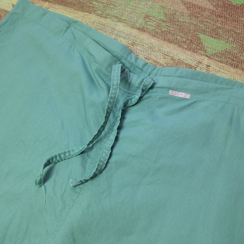 グレーとグリーンの中間カラー、やや薄手の100%コットンツイル生地。ウエストはドローストリング、ヒップ1ポケット、アウトサイドはシームレスでぐるっと巻いてインサイドのみシームあり。