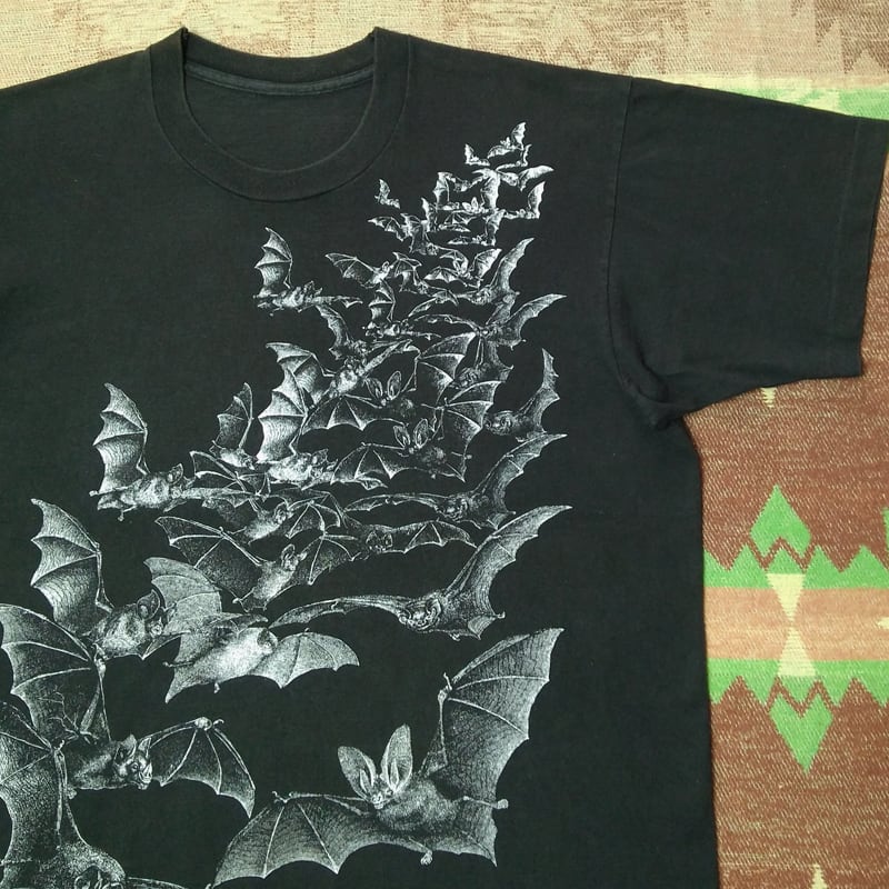 黒ベース、コウモリ柄プリント。1988年コピーライト。グラデーションになった正面も良いですし、バックプリントも絶妙ですね。