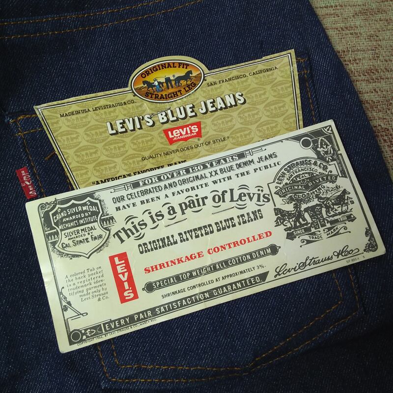 フラッシャー付きデッドストック。トップボタンやリベットに若干の錆び、ヒップ下やサイドにほんのわずかな擦れ色落ちは見られましたが、目立つヤケ等のない良好なコンディションです。