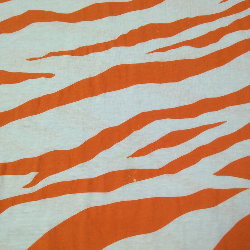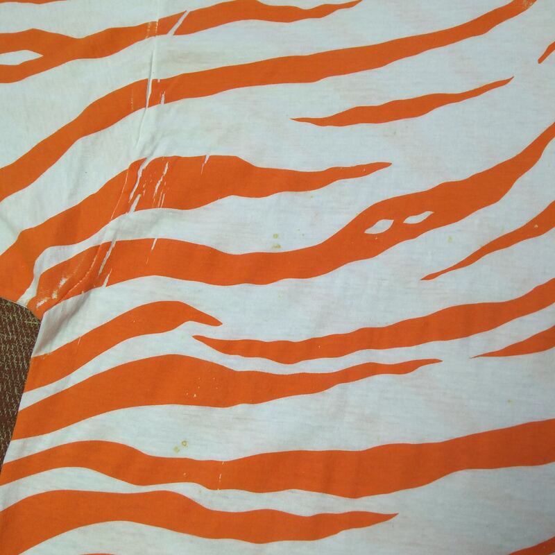デッドストックをワンウォッシュ、未使用品です。プリント時のものと思われる染料やラバーの付着のようなものがやや多く見られます。また背面にはプリントがズレた部分があります。柄物ですので気にせず着られる方も多くいらっしゃると思います。