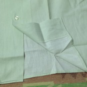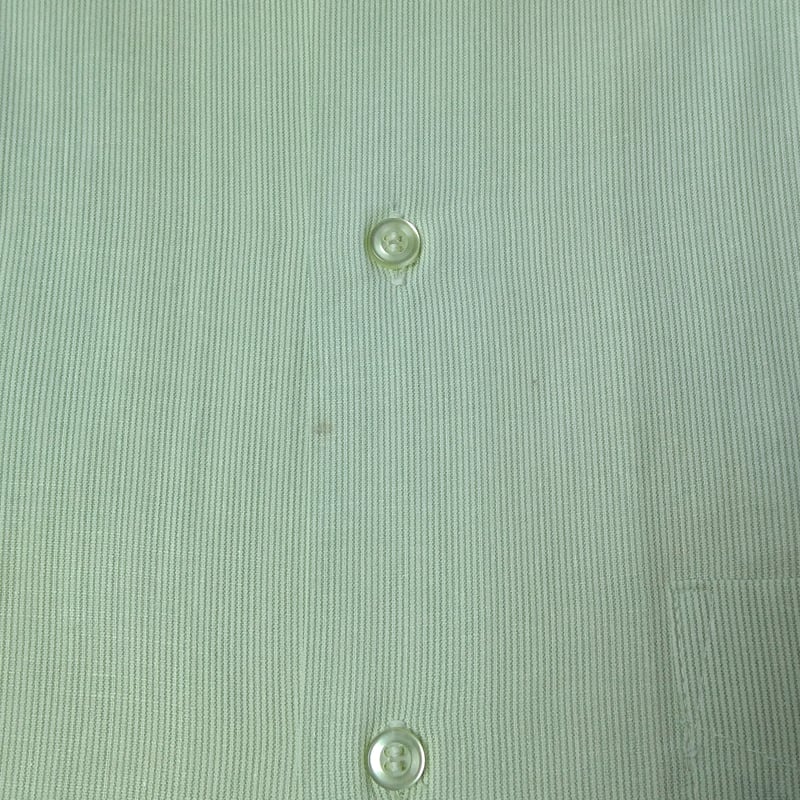 白ベースにグリーン(グレーっぽい)のピンストライプ、100%コットン生地。織りではなくプリントのストライプです。襟はミシンステッチ・プラ芯入り。