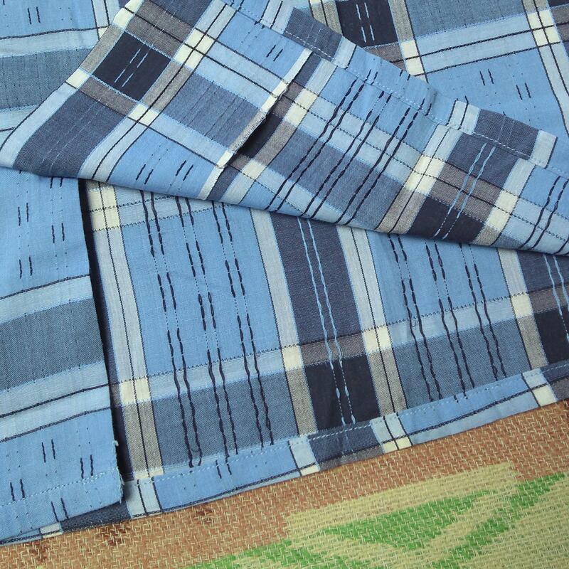 サックスブルー系チェック、コットン生地。織り柄入りのとても良い生地を使用したシャツです。丸いポケットもポイントです。