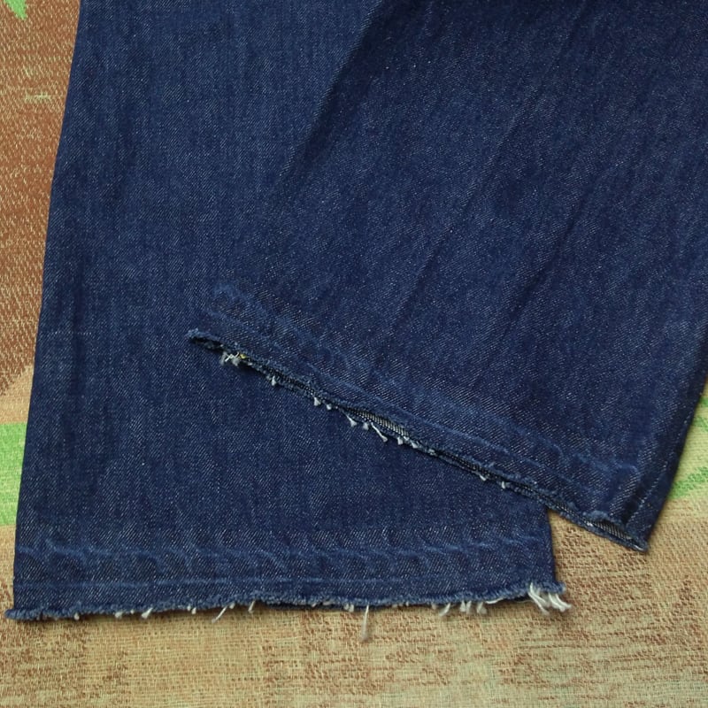 裾が解かれていて切りっ放しの状態、左膝裏あたりに小さなダメージがあるくらいで、大きなダメージや気になるシミ汚れはありません。かなり色の濃い良好なコンディションです。