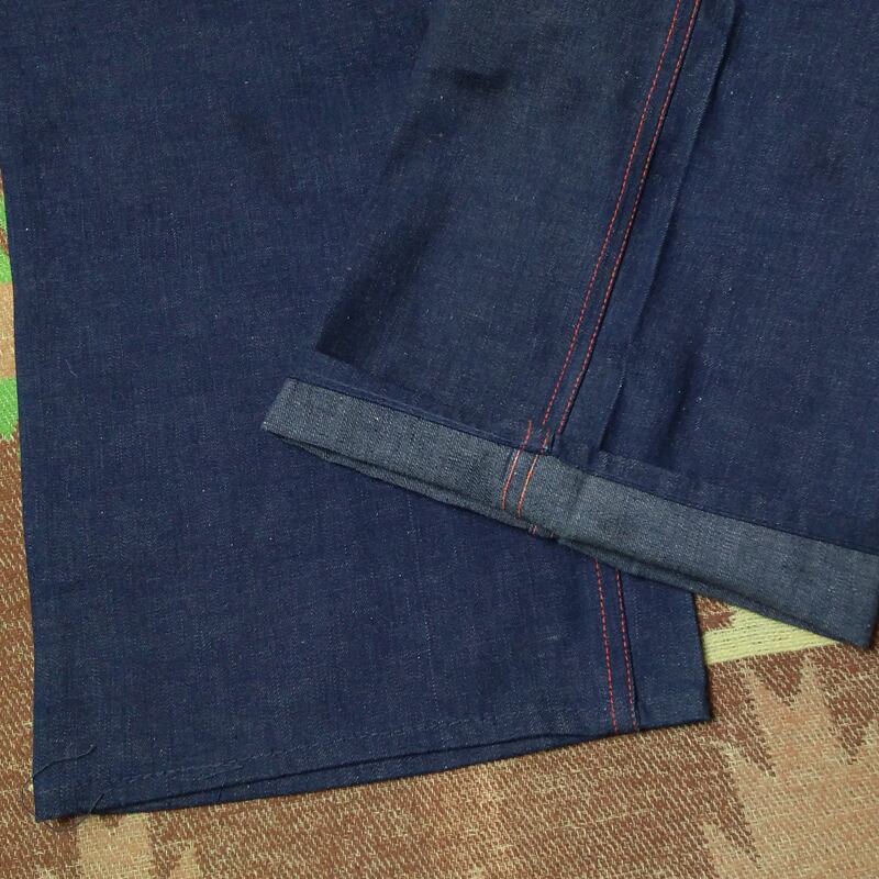 ジェルトタイプの8オンスデニム。赤味が強いオレンジステッチ、メインシームはダブルステッチ。