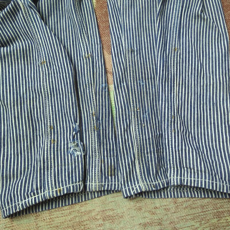 裾はロールアップして両サイドに金具を打って留められていました。金具を外した痕の擦れやダメージ・錆びシミなどあります。右ヒップポケットボトムとツールポケット・右膝にダメージとリペア・ステッチ抜けがあります。