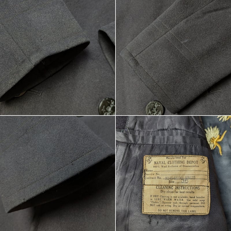 ところどころくすみ汚れや表面虫食い、襟や袖口を中心に擦れ、など見られますが、特に大きなダメージはありません。2007年にドライクリーニングに出したラベルが付いています。その後着用されているかは不明ですが、ビシっと整った印象を受ける良好なコンディションです。