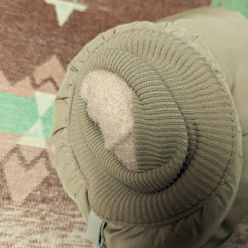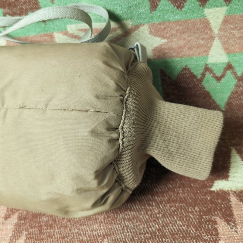 タンのナイロン/コットンシェル。内側はナイロンフリース、グースダウンがパンパンに詰まっていて防寒性が高いです。