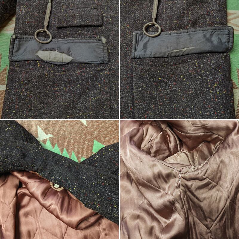 正面ボタンすべて交換(トップボタンはなし)、袖ボタンは擦れが見られ左1つ欠損。肘から袖口や襟に擦れて柄が薄くなった部分、袖口に擦れダメージ、右肘に白い塗料付着、ポケットフラップや袖ストラップ裏のサテン生地にダメージ、左脇に摘んだような箇所がありライニングも手縫いで塞いだ痕があります。
