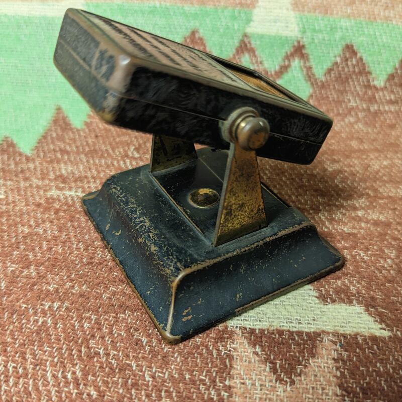 製品を生産していたメーカー自身のアドバタイジング、ベース部分のつくりも比較的見かける丸型のものと異なります。味わい深い塗装の剥げ具合、ブラックとゴールドのコントラストが美しいです。
