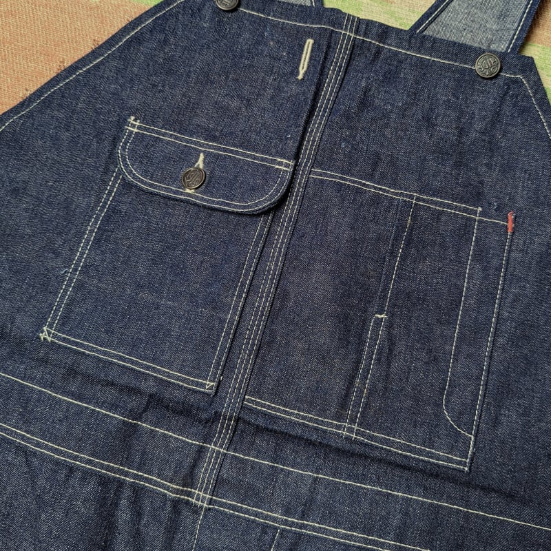 サスペンダー金具とフラッシャー類が欠損。ビブ右上ボタン付け根に打ち込みの際のものと思われるキズがありました。ボタンに緑青、右ヒップポケット上などにわずかな擦れ色落ち、いくつか元々の生地の織りむら等は見られますが、目立つヤケ等のない良好なコンディションです。