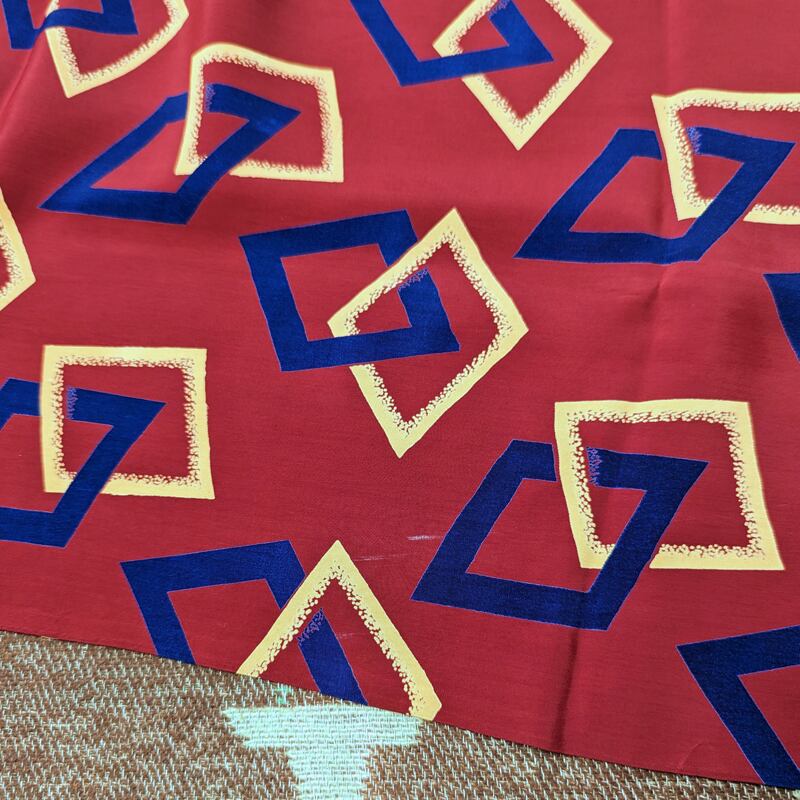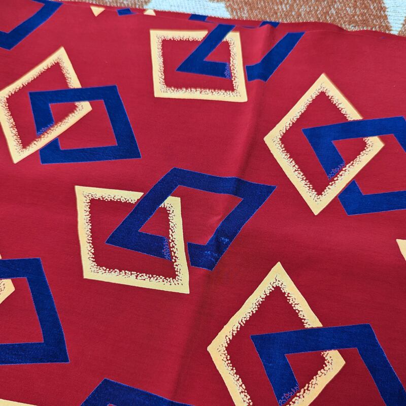 くすんだ赤色ベース、ネイビーとベージュのプリント柄。