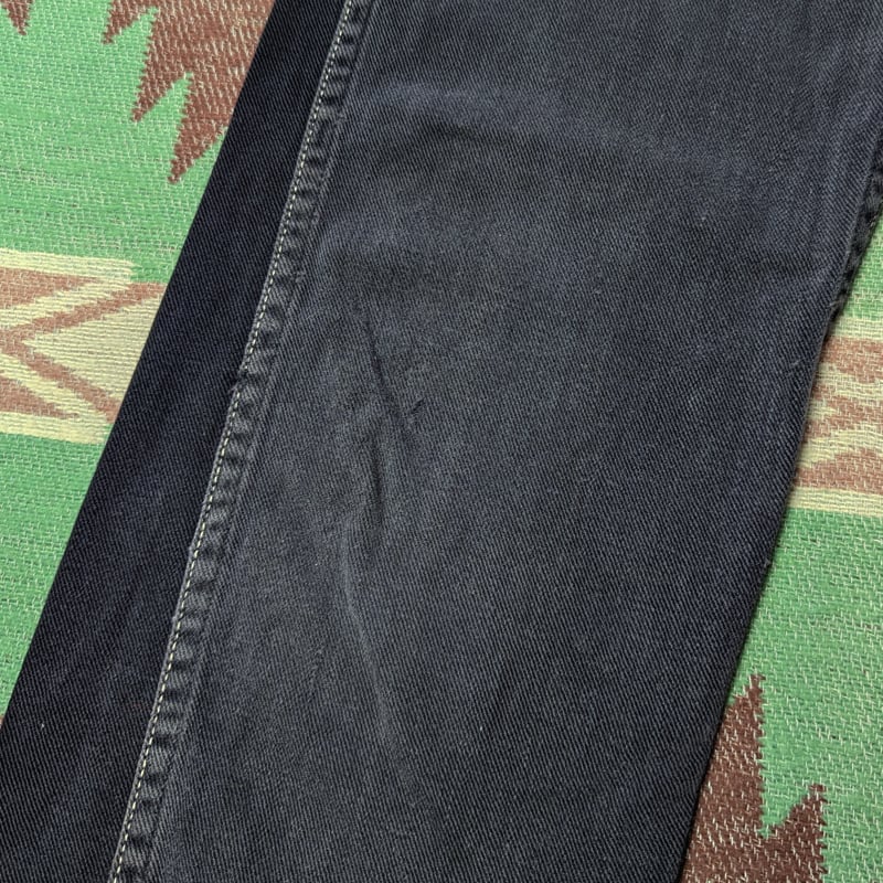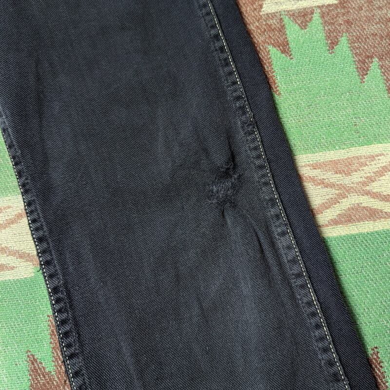 全体的に黒が色抜けして墨黒といった色目になっています。擦れ・ダメージ・シミ汚れ、簡素なリペア、ステッチ抜け、金具類に緑青・擦れなど見られ、特にパンツはダメージが多いです。コレクションとしては十分納得できるものと思います。