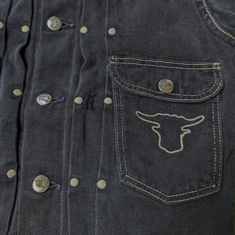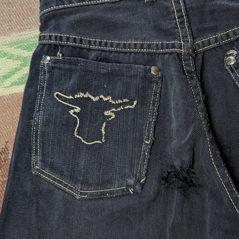 ブラックデニム(ツイル・カツラギ)生地、ポケットに牛のチェーンステッチ刺繍。スナップボタンヘッドは刻印入り、リベットヘッドにも牛の刻印が入り、付属パーツ類も特注品でこだわったつくりです。GRIPPERピンロックジッパー。