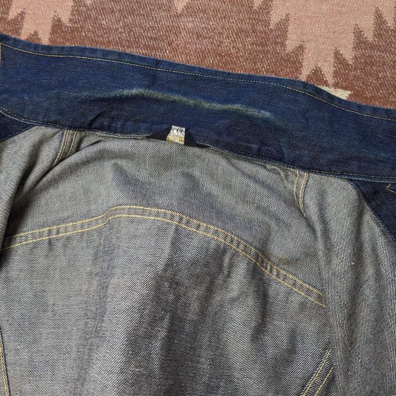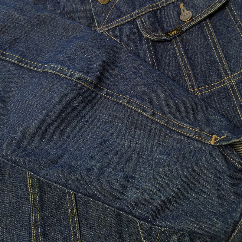 水通しなしで着用されていたと思われる状態からワンウォッシュしています。「青黒」という表現がしっくりくるこの時代のLeeらしい色味、激しく縦落ちしていくであろう様子も垣間見られます。